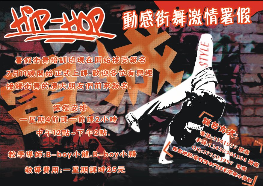 QUOTE(water-pop @ 2007年08月30日 Thursday, 05:42 PM) 海报不错~!有没有POPING班和LOCKING班啊? 我做教练./ [snapback]1890545[/snapback] 你做教练? 你够资格吗? 就你那基本功!