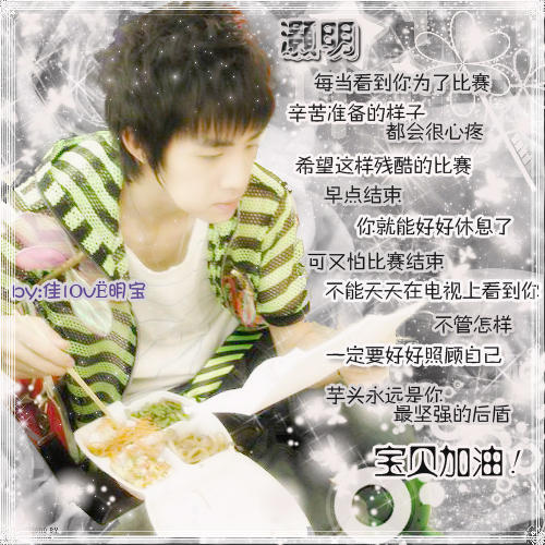 我,俞灏明,19岁,你,王栎鑫,18岁,在地球上的同一个城市-广州相遇了。在广州赛区,我们的关系只是很普通的好,那时我和洲成关系比较好,可能是大家都说粤语的关系吧,那时对你没什么特别的感觉,到了广州10进1的时候,我们成为最后的冠军候选人,当时被你的海豚音惊艳到了,这个广州冠军你是应得的,当时我抓住你的手一起往上举,这大概是我喜欢你的开始吧。突围赛上的最后PK,你很有性格地把手上的纸牌摔到地上,那时说真的,你就算投给洲成我也不会怪你,他确实受了不少委屈,最后我赢了,广州赛区里只剩我和你了,自然我和你关系是最好的,我是这样想的,但可能是你的性格太外向了,和谁都会合得来,我开始有点嫉妒了,但我觉得这是很正常的,三个死党在一起,其中两个好一点,另外一个肯定会不高兴,不是这样的吗?在城堡生活,我真的很不惯,犯了思乡病,向你倾诉时,你总会取笑我,说我长不大,像小孩一样,在里面我最熟悉你,想和你说话时,你身边总是有个苏醒在,他逗得你好开心啊,哎,我只有在自己床上玩PC,眼睛看着电脑,心却在你那里,总想听你跟苏醒在说什么,早上起床的时候,我看见隔壁的你还在睡时,我就会再次躺回床上,不知为什么,就是不想比你起得早,直到你很大声地叫喊到:"灏明,起床咯!",渐渐地对你产生了依赖,不是你叫我,我是不会起床的,你成了我的闹钟了。13进11,11进9, 9进7,我们都顺利通过了,你还记得吗?你小考第一,我票数第一,分别成了两队的队长,我率先晋级了,那时的我很紧张,很怕失去你,但我听见你晋级时,我以刘翔12秒88的速度飞扑向你,我承认我不会掩饰自己的感情,我紧紧地抱住你,差点把你砸在地上了,那时我真正认识到我太在乎你了,我对你的感情比兄弟还深,自从那次之后,你对我更加关切了,午饭的时候,你帮我占位置,还伤害了苏醒,说那是留给我的,把我弄得不好意思了,你每次都要我帮你盛饭,说什么: "你比我帅,但你没有我坏。"哎,我哭笑不得,我差不多每次都只吃一碗饭,你就取笑我,说我又不是女孩子,不用保持身材,为啥吃那么少,哎,你都不知我吃不惯这里的菜啊,好想念粤菜啊,有一次,你说要帮我盛饭,我说了不用,你硬要来,只见你装了好多饭,然后狠狠地用勺子往下压,汗啊,这不是两碗饭合一吗?真是败给你了,我唯有硬着头皮啃了。7进6,你被待定了,你跟我说:"灏明啊,我有预感会被淘汰啊!我们约好不要哭好吗?"我激动起来了:"你乱说什么啊!都还没比赛。。。",我都没说完,眼眶就湿润了,我匆匆地躲进洗手间,很讨厌自己泪线发达,动不动就想哭,我早就预料到芒果台会拿我们来开刀,两次 PK,第一次大众评审投票其间,我不断地看你,拍拍你鼓励你,是我做错啦?你怎么比我先哭了,我们狠狠地抱在一起,很痛苦,第二次PK,我已经无心恋战了,唱着"月光",脑里一片空白,还以为结束了,说了句 "谢谢",但音乐还没结束,是我搞错了吗?怎么还要唱一遍,我草草地唱完了,我心想,这次大众评审应该会投给栎鑫吧,他晋级就好了,我的命运就由芋头决定吧,但事与愿违,我晋级了。你和吉杰PK,当宣布最后的票数时,我呆了,不是真的,怎么可能,当你坐在我旁边时,终于忍不住了,这19年的泪水一次过暴发了,我们紧紧地抱着,痛哭着,时间在这一刻停住了,我崩溃了,比失恋还惨1000000倍,你离开城堡时,我始终躲在后面,你望了我一下,然后没说什么就走了,我回去房间,木木地坐在床上,突然发现枕头边放了一张纸,打开一看,熟悉的称呼,熟悉的字迹:国民DD,哈哈,灏明,我知道我的离开你很痛苦,但这就是比赛,我和你迟早有一天会分开,答应我,不要放弃,带着我的梦想一直走下去,我希望你能恢复到广州比赛时的状态好吗?努力了就行了,不要老想那么多,我知道你又哭了,笨小孩,努力比赛,我会在你背后支持你的。最后想你听一下这首歌"亲爱的,你在哪里",听完后,你一定会明白的!你的正太哥:栎鑫。我拿出MP3,居然有这首歌,是你借我时下载上去的吧,音乐响起了: