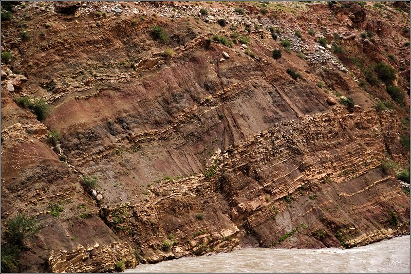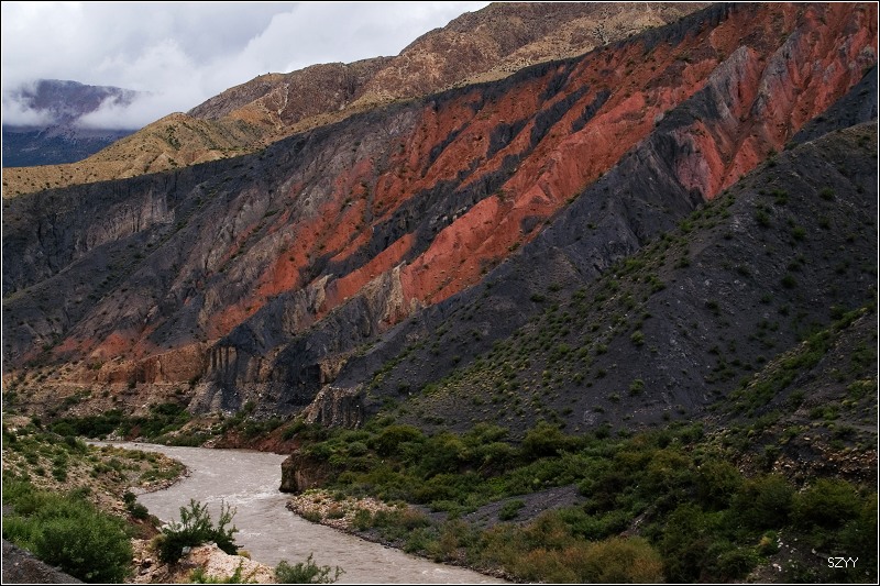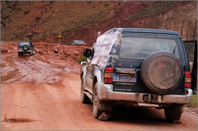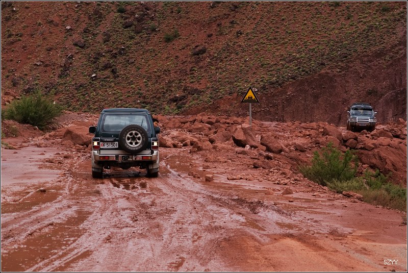 继续前进,周围的山和土地都是红色的,不久遇到一处大的泥石流,前面已经堵了一些车,整个路面全部被淹没,下车看看情况,一辆桑塔纳陷在中间,正是一直跑在我们前面的一辆当地车。几个武警说那辆车油管被刮断了,有辆大车把桑塔纳拖出去,整个路面完全看不到了,到处是泥浆和乱石,不知道哪里深哪里浅,这时一辆IVECO准备往过开了,我立刻把钥匙给了北方郎,让他开,毕竟他更了解自己的车。我们马上上车,跟上IVECO,看着前面车压开的地方,找好线路,车还是侧滑了几次,并且有些刮底,毕竟是四驱车,顺利过了泥石流,正准备跟老曲讲讲怎么过呢,结果一回头,他的宝来居然已经过来了,他也是跟了一辆车,选准线路过来的。老曲开车的技术没得说,毕竟是深圳十大试车手之一。