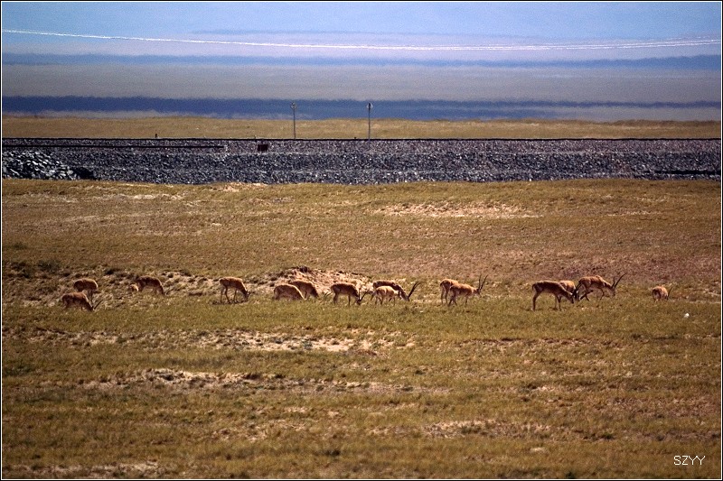 我们立刻放下车窗玻璃,先是一阵快门声,先拍下来再说,第一阵快门扫射以后,那些藏羚羊仍然不慌不忙地边吃草边走,我们这才下车,支起脚架开始第二轮快门扫射,羚羊越走越远,我们这才收起脚架和相机。总算是皇天不负有心人,我们终于看到藏羚羊了,而且我们居然还拍了下来,虽然离的很远,但总是比拍不到强多了。这下大家满足了,继续向昆仑山进发。