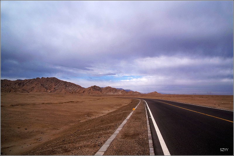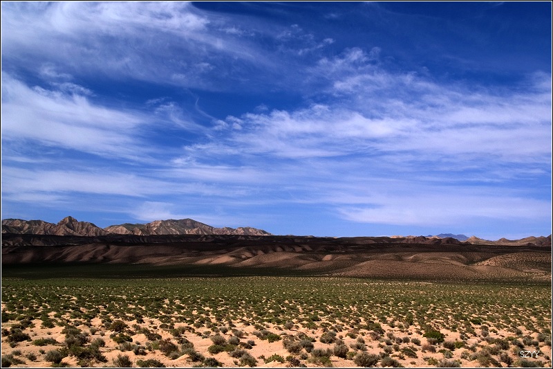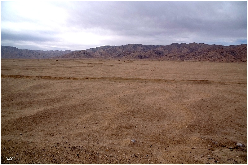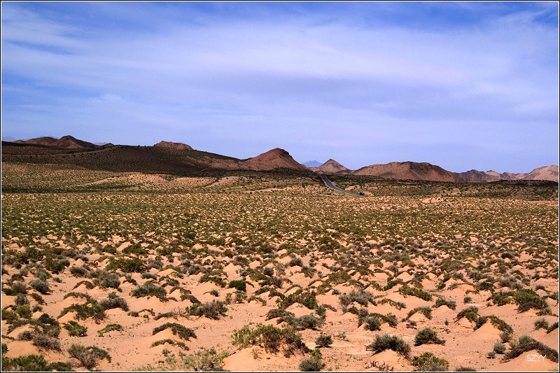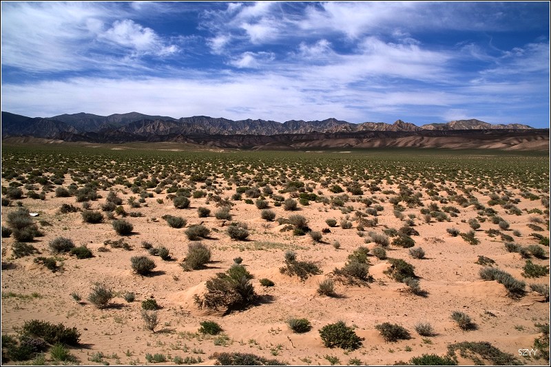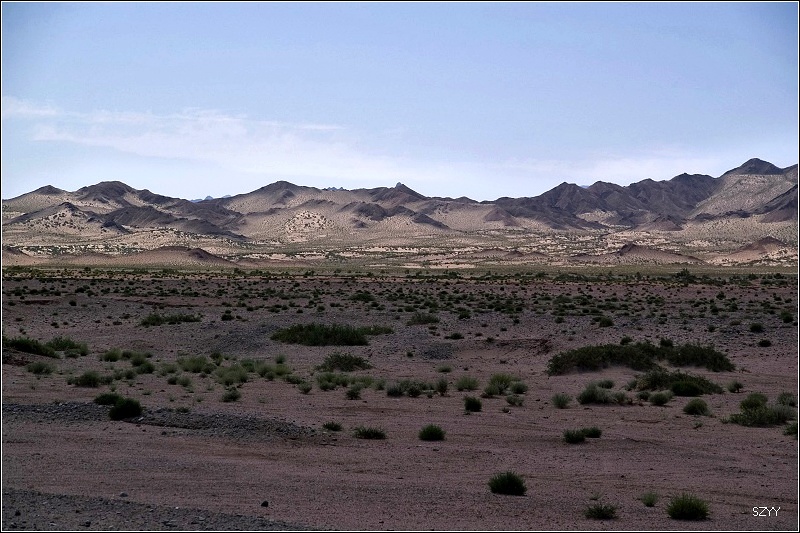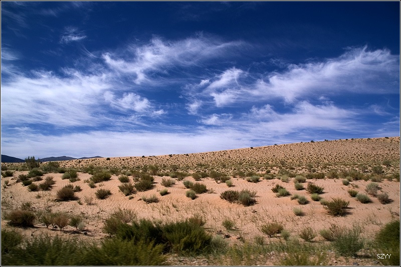 出了城,过收费站,往西宁方向,进入无人区。左侧是一望无际的柴达木盆地,右面是连绵不断的橙黄色的布尔汗布达山脉,景色极为单调乏味,除了沙漠中星星点点的红柳外,几乎没有绿色。开车很容易困乏,先是北方郎开,然后换达咏,这段路很长很长,似乎永远走不完一样,他们开车,我们就在后面睡觉,睡了几觉,醒了几次,外面的景色似乎没有任何变化,也很少看到其他车辆,就我们一辆车,孤零零地在一望无际的平原上飞驰,甚至让人产生一种幻觉,就是在玩游戏机,持续着开车的同一个姿势,一坐就是几个小时,确实很累。笔直的道路延伸到天边,车速很难控制,因为周围近处没有什么参照物,稍不小心就达到一百五六十km/h,甚至达到180km/h,也不觉得快,看看时速表,才发现,赶紧把速度降下来。