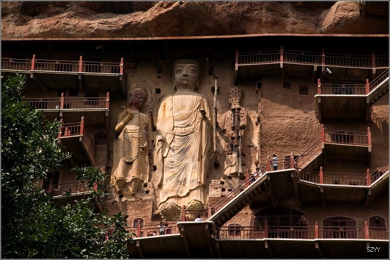 当人们进入麦积山风景区后,首先映入眼帘的是凭崖而凿的一组雕刻造像。中间一座佛,高达15米,左右两尊菩萨侍立,喜笑颜开,迎送来往游客。行至山前,抬头仰望,只见龛窟密如峰房,依窟建檐,层层相叠。栈道云梯修建于悬崖,浅龛深窟开凿于峭壁,其建筑高超雄伟,工程奇险浩大,令人赞绝。历代游客诗人,虽惊慕不已,敢于攀至顶端者却少如凤毛麟角。唯心史观有五代诗人王仁裕斗胆攀登,才写下了:“蹑尽悬崖万仞梯,等闲身与白云齐;檐前下视群山小,堂上平分落日低;绝顶路危人少到,古岩松健鹤频栖;天边为要留名姓,拂石殷勤手自题。”的切身感观。不过,现在的麦积山经过大规模的加固修整和栈道修复,摇摇欲坠的崖体已经稳定,山上栈道也宽阔整齐,安全可靠,昔日王仁裕笔下的险恶情景早已成为历史。人们可以放心大胆地登游各个崖阁,随心所欲地进入各个洞窟,感情奔放地远眺山下美景。