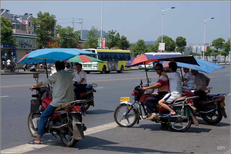 长沙街头摩托车多有遮阳伞,很实用