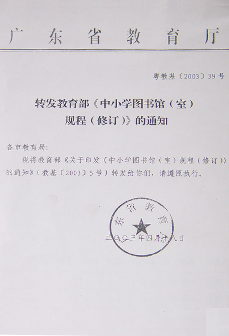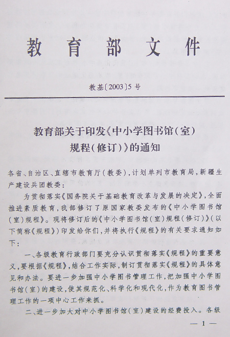 为贯彻落实《国务院关于基础教育改革与发展的决定》,全面推进素质教育,我部修订了原国家教委发布的《中小学图书馆(室)规程凯现将修订后的《中小学图书馆(室)规程(修)》(以下简称《规程》)印发给你们,并将执行《规程》的有关要求通知如下: