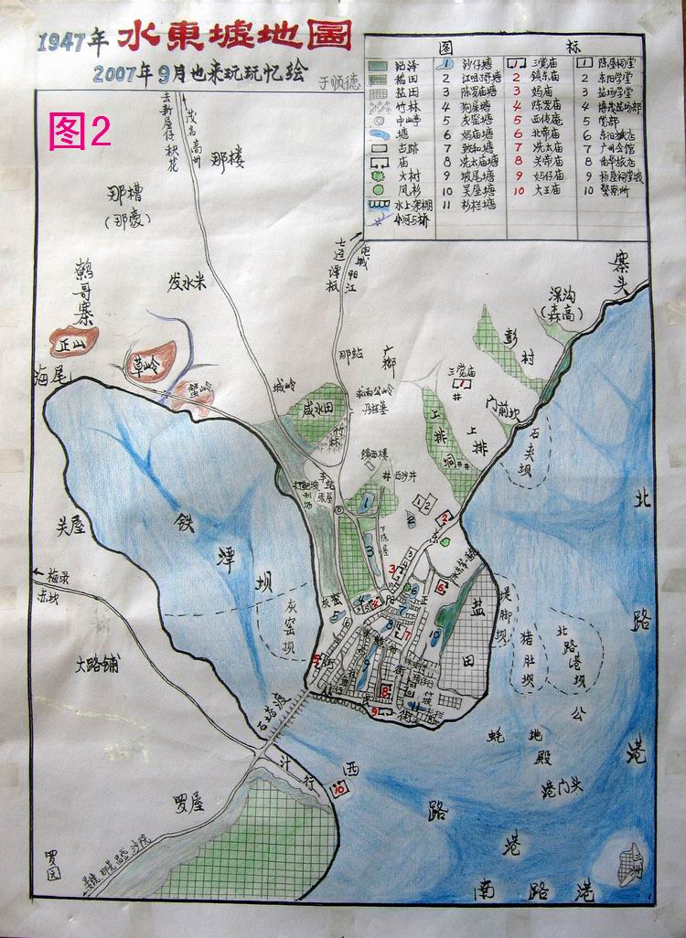 地图绘画的也较生动,如图标、颜色、水东湾海水的深浅度等,文字书写也有点古韵味,特别是“水东墟地图”这几个隶体字。 铁潭坝应是现在的西湖吧,比原来小了很多,上排垌##应是东湖了,原来是沼泽地,车站位置好象不变,而海岸线往外推出了很多。