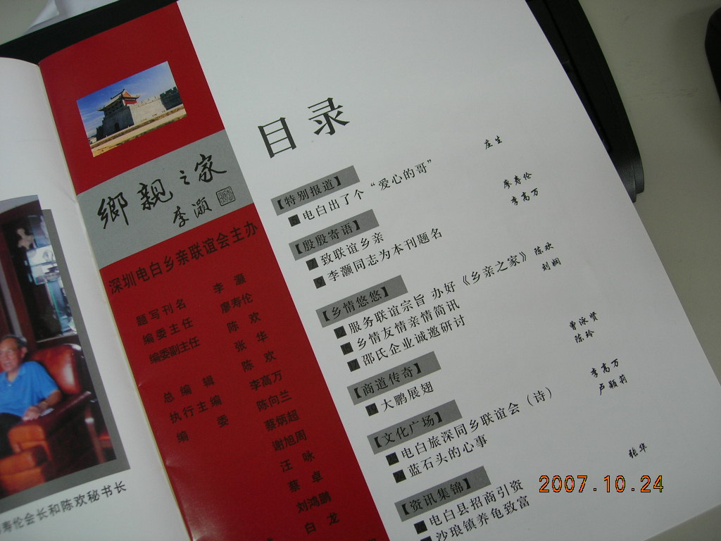 FRANK 深圳同乡社区 荣誉会员 注册 2005-10-30 消息 1,963 反馈评分 1 点数 61 2007-10-24 #2 届时派发深圳电白乡亲联谊会的07年最新一期的会刊<<乡亲之家--电白人在深圳>>给同乡朋友. 附件 DSCN4393.JPG 161.4 KB · 查看: 457 DSCN4396.JPG 160.7 KB · 查看: 474 DSCN4394.JPG 161.7 KB · 查看: 439 DSCN4395.JPG 141.2 KB · 查看: 427