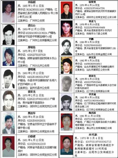昨日,广东省公安厅对外发布公告,对田奋超等100名重大刑事案件在逃人员予以公开悬赏通缉。任何公民发现表格所示被通缉的犯罪嫌疑人,均可立即将其扭送公安机关处理。凡直接扭送或提供线索协助抓获一名被通缉人员的公民,省公安厅将对其兑现奖励金人民币5000元,并对举报人身份绝对保密。