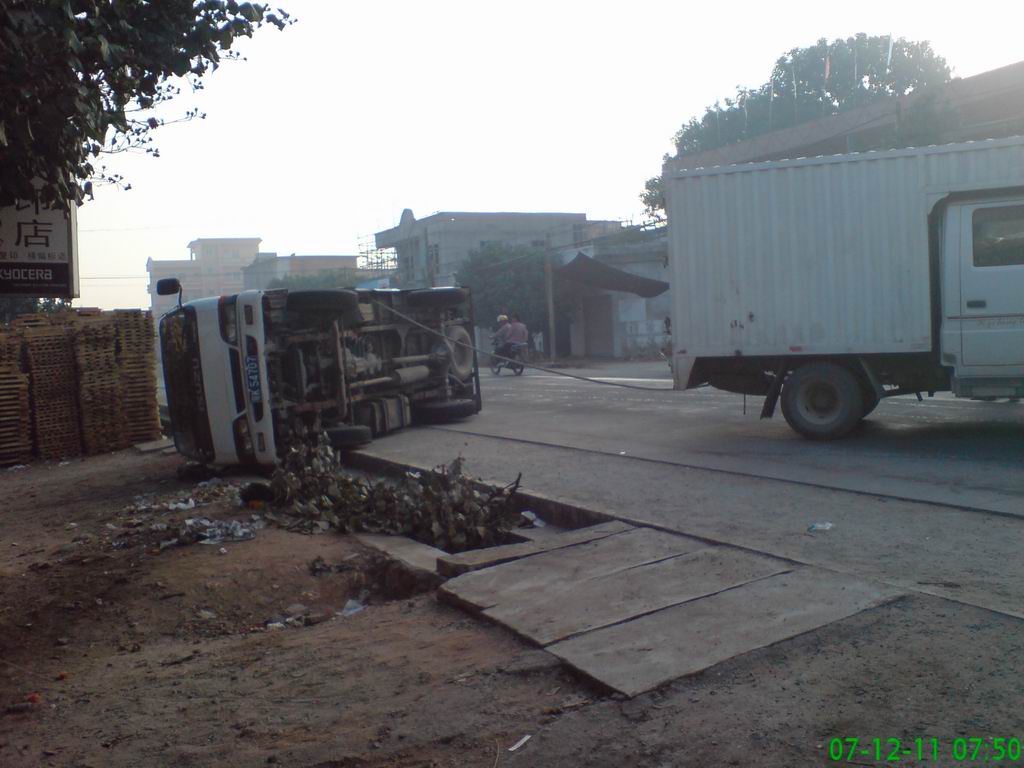 今天早上的轻雾造成路面很湿,龙山翻了一辆卡车,人员平安。 虽然天气预报说是轻雾,但今早近八点时路人看见公路很湿。在原龙山镇政府门口,一辆集装箱车翻倒退在地上。 知情人介绍,今天早上五时多,这辆车是经过龙山开向博贺方向。由于路面打滑,车辆翻倒。最后,车倒在北边,车头向西北。过路人感觉很奇怪:车怎么能翻成这个样子? 所幸的车上的两人(含司机)都平安无事。车身也没有大碍。 八点钟后,车主试用另一辆来拉,使车翻回来,但是没有成功。 过路人感叹:即使是轻雾,开车也不可不小心。