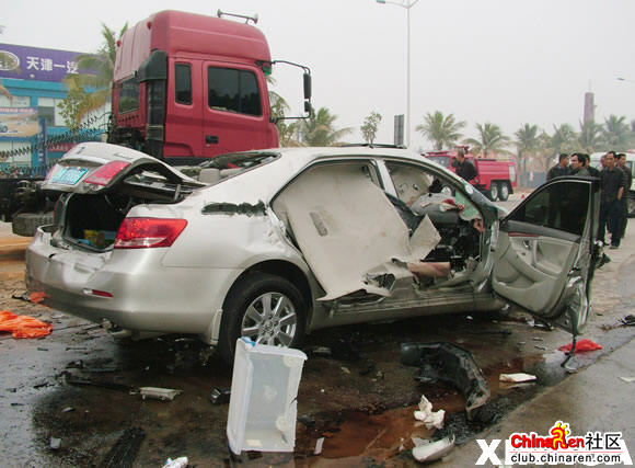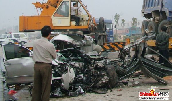 据称,当时受严重撞击后,小轿车不久即起火燃烧。当地交警等部门经奋力扑救并将大火扑灭后,立即用工具撬开小轿车车门进行抢救。由于撞击猛烈,小轿车车头及驾驶室严重损毁,男司机的头颅已被刮飞到地面上,副驾驶位的另1人(女)已血肉模糊、支离破碎;后座上则坐着4人(1男3女),其中3人也已血肉模糊,证实已死;另1人被救出时尚有微弱呼吸,但被救出后在送院途中也证实死亡。