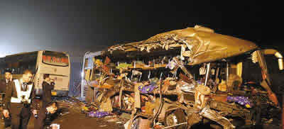 核心提示:1月7日凌晨1时许,距湛江约半小时车程的渝湛高速发生一宗特大交通事故,一辆从深圳开往南宁的大客车与同向行驶的一辆油罐车发生追尾,之后大客车撞过公路绿化带,与反向迎面驶来的另一辆从南宁开往珠海的大客车发生相撞。10人当场死亡,约50人受伤。
