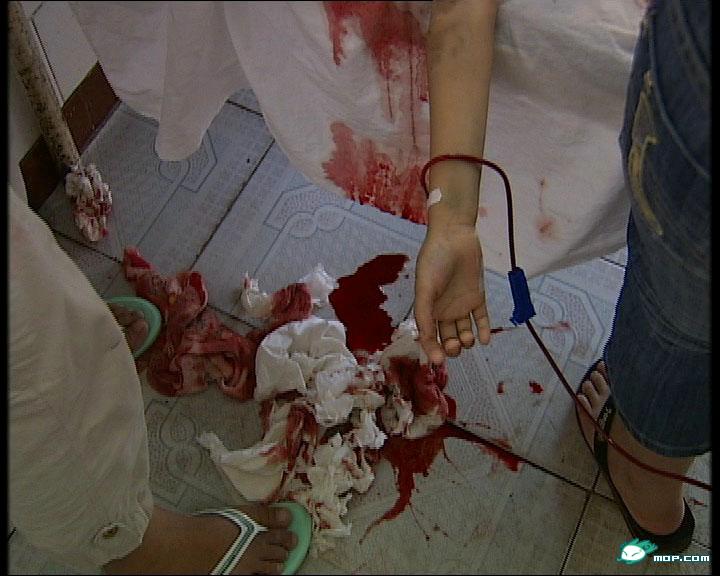 于是他们迅速拨打了120,同时打电话给在北京打工的小慧的母亲陈许春。从电视里面看到,在医院里也聚集了医院工作人员和病人差不多一千多人,小丁香病床前的地上流下了大摊的血迹和擦满血的卫生纸,(见图片)触目惊心