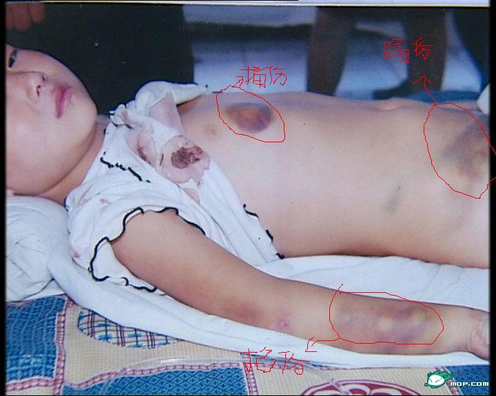 现场弥漫着悲痛的气氛。而小慧身上简直没有一块好皮肤,全都是被虐待暴力殴打形成的各种颜色的伤疤和痕迹,有手指和指甲狠命掐的,有用粗木棍子捅得几寸深的,还有被鞋子踢的大块的淤伤(见图片),几乎都在致命部位,有的在肾脏旁边,有的直接踢到了小腹,下手之狠,让人惊讶,暴行实在让人发指。