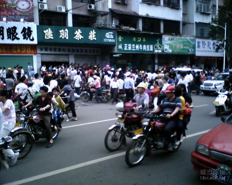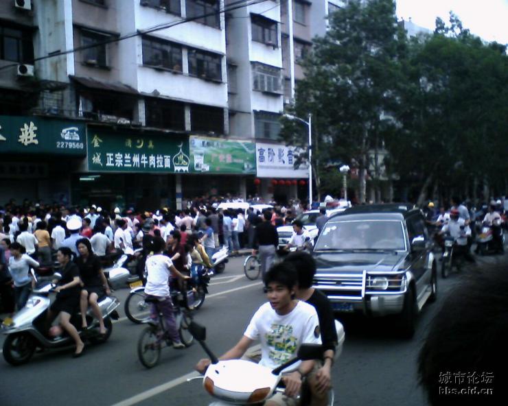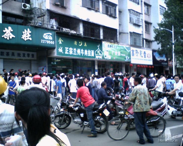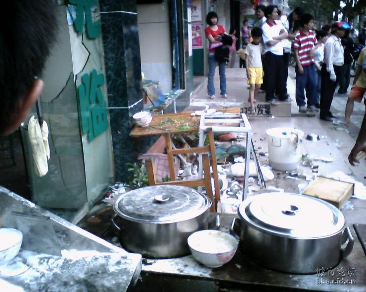 今天下午3时许,记者接报赶到油城四路事发现场,发现有数十人围住一面馆门口,门口玻璃破裂,胶桶等杂物散落地上,馆内已空无一人。多位警察在现场维持秩序。部分群众充满怒容,向围观者诉说面馆里面三人冲出大街打一少年的行径。