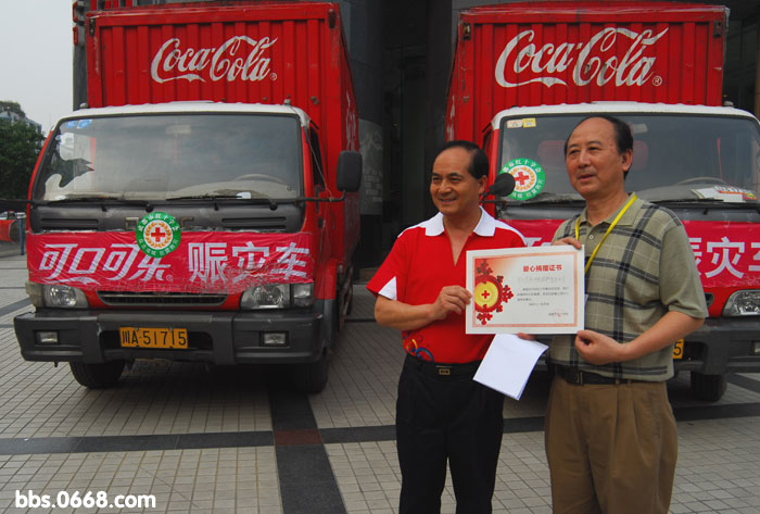 据了解,早在5月13日成都可口可乐饮料有限公司已向灾区无偿运送了上万箱饮用水及几百把大遮阳伞,以解当地群众燃眉之急。截止5月21日可口可乐(中国)公司累计向灾区捐款人民币1700余万元,其中包括现金和饮料。目前,可口可乐在全中国所有的装瓶公司还在不断地用各种形式捐款、捐物持续不断地为灾区人民排忧解难。