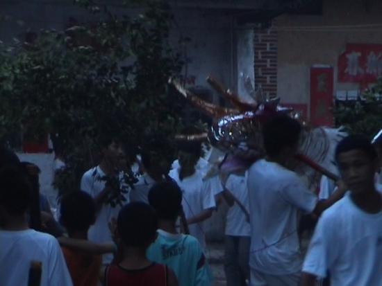 伴和着乡土风味浓烈的民间吹打乐,舞起。龙头威武壮观,银鬓玉角,光彩照人。树仔人认为树木旺树仔。所以龙身用树枝续成。柚子做龙珠在前引舞。龙头昂视、龙珠劲抖,龙身翻腾,龙尾律动。忽跃忽伏、时缓时急,如凌空飞腾,如潜海穿浪,如遨游九天。这群村民用淳朴的舞舞着血脉传承,舞着对上天的敬畏,舞着对祖辈的敬意。