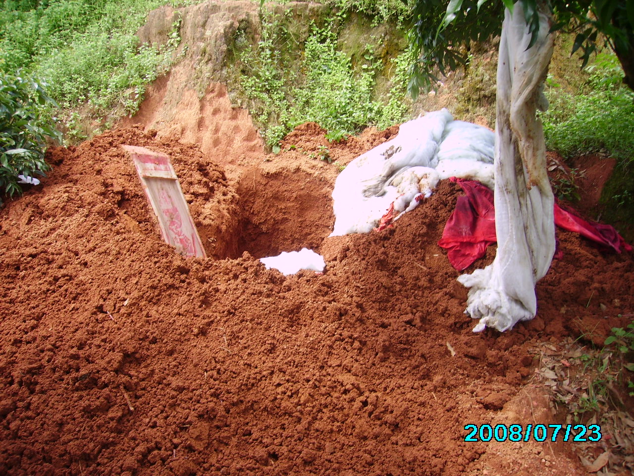 2005年4月7日,广东化州市(隶属茂名市)江湖镇陈谢村侧一荒山上,71岁的村民莫隆盛“扑通”一声,跪倒在一堆黄土前,泪流满面。这堆黄土曾经葬着莫的母亲,如今,坟墓被人偷偷挖开,莫母尸身下落不明。