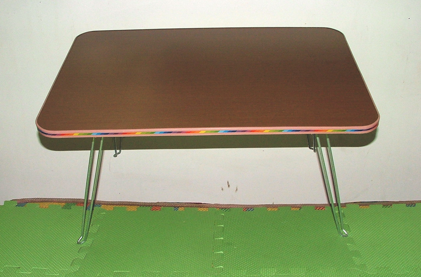 [材质]:桌面为木质纤维一次模压成型,专用桌面面板,自然木纹饿(有多种颜色可供选择),表面光滑,耐磨易清洁,四周为半圆型弧度不伤手.脚为钢制,表面电镀处理,光亮不生锈,可折叠.