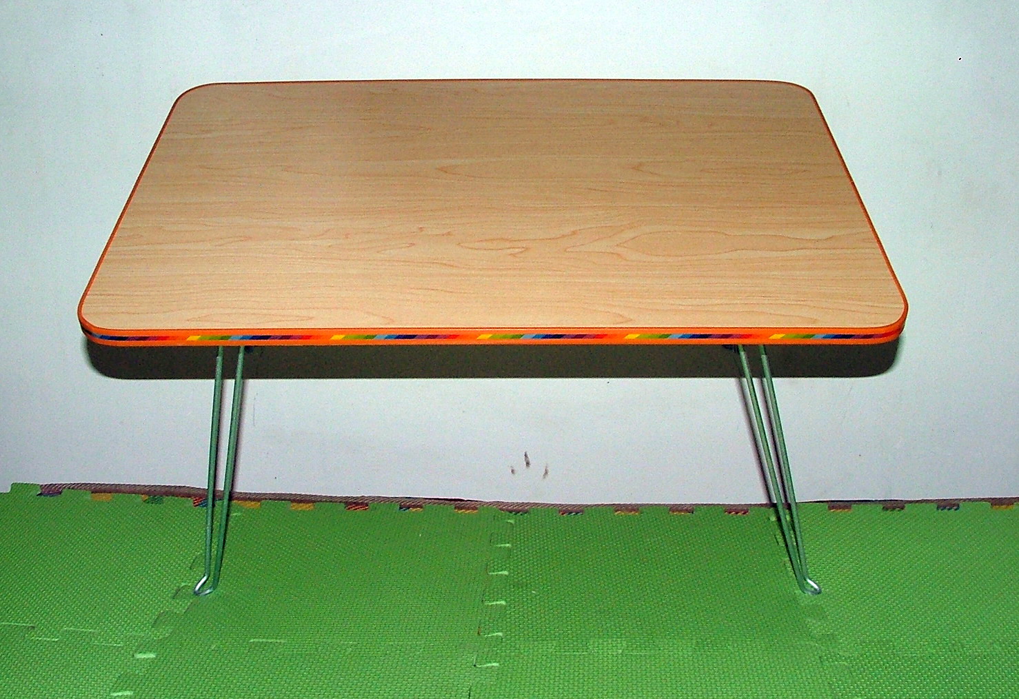 [材质]:桌面为木质纤维一次模压成型,专用桌面面板,自然木纹饿(有多种颜色可供选择),表面光滑,耐磨易清洁,四周为半圆型弧度不伤手.脚为钢制,表面电镀处理,光亮不生锈,可折叠.