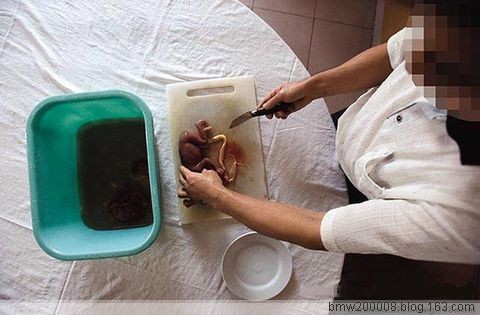 台商亦说,吃这一盅要三千五百元人民币,其他细节,他不理了。记者听他们在聊,流产或堕胎的死胎,中介人就包给产婆几百块红包,若是接近足月引产的活胎,则要付两千元红包给女婴的父母,当是收养;至于婴儿交到餐厅时,都已死亡,之前是死是活,已无从细考了