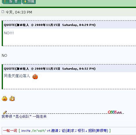 QUOTE(奶茶-王子 @ 2008年11月15日 Saturday, 09:54 PM) 先引用你想引用的话``然后引用的那个字变色了 再按下面的“添加回复” [snapback]2558242[/snapback] 哦,明白.