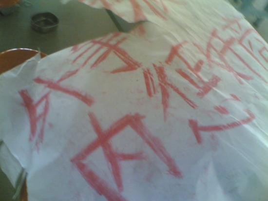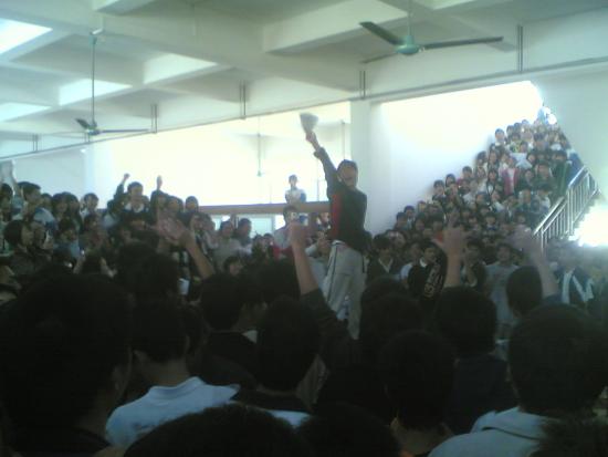 不久.饭堂人员不得不将臭猪肉换掉.让拿了臭猪肉的学生们重新打过饭.当日13:45分左右。B栋男生宿舍楼纷纷走出走廊起哄.要求饭堂对此作出合理解释.但由于饭堂未有行动(图1)。当晚.自修自后.B栋宿舍楼再次起哄.高三班主任们不得不出动.让起哄的同学回去休息,但是随之而起的是女生宿舍那边也起哄起来了.她们高喊:“还我健康!!”“臭猪肉!!”“加菜!!”“黑心老板!!”甚至还有同学喊 !! 本人极度鄙视一中的饭堂老板! 极度不服饭堂的管理制度! 对一中饭堂的食物极度排斥 、恶心!