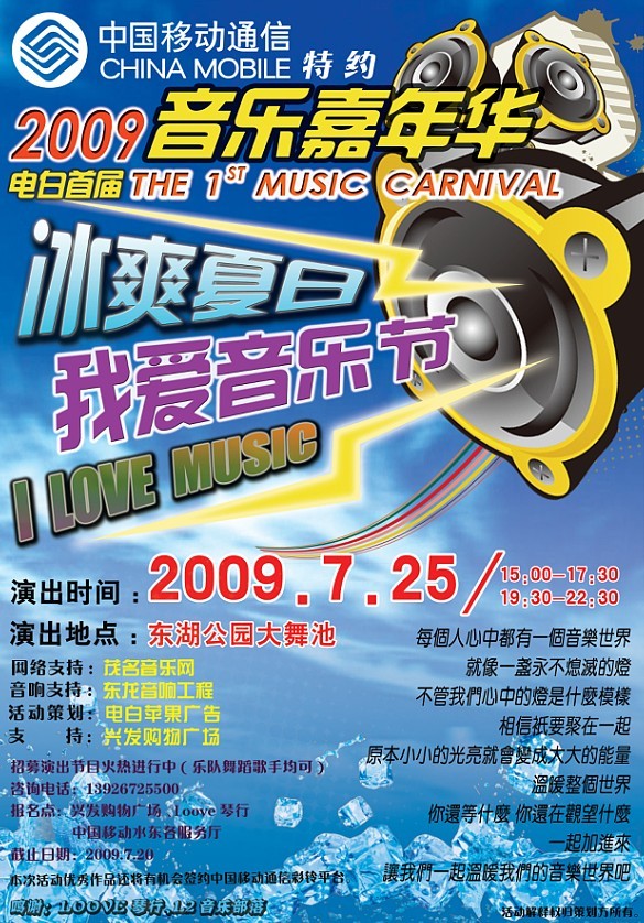 [attachmentid=214931]报名表下载 本次音乐嘉年华主要汇集电白本地有名气的音乐人的和外出的本地音乐人才的一次音乐盛会,动用人员和规模之大都是空前的。有兴趣参与的朋友可以电话联系参加试音。音乐形式不限。最重要是新意。(13926725500)
