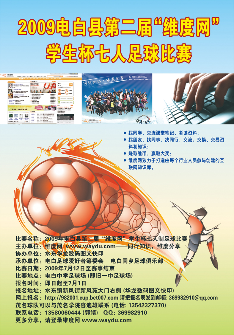 华 华龙快印 初中三年级 注册 2008-02-04 消息 502 反馈评分 0 点数 1 2009-06-29 #1 2009电白第二届“维度网”学生杯七人足球赛的宣传海报出来了,届时会将海报贴于各学校门口和足球场等地方,请大家支持一下![attachmentid=216396] 附件 海报-上传+.jpg 175.8 KB · 查看: 493