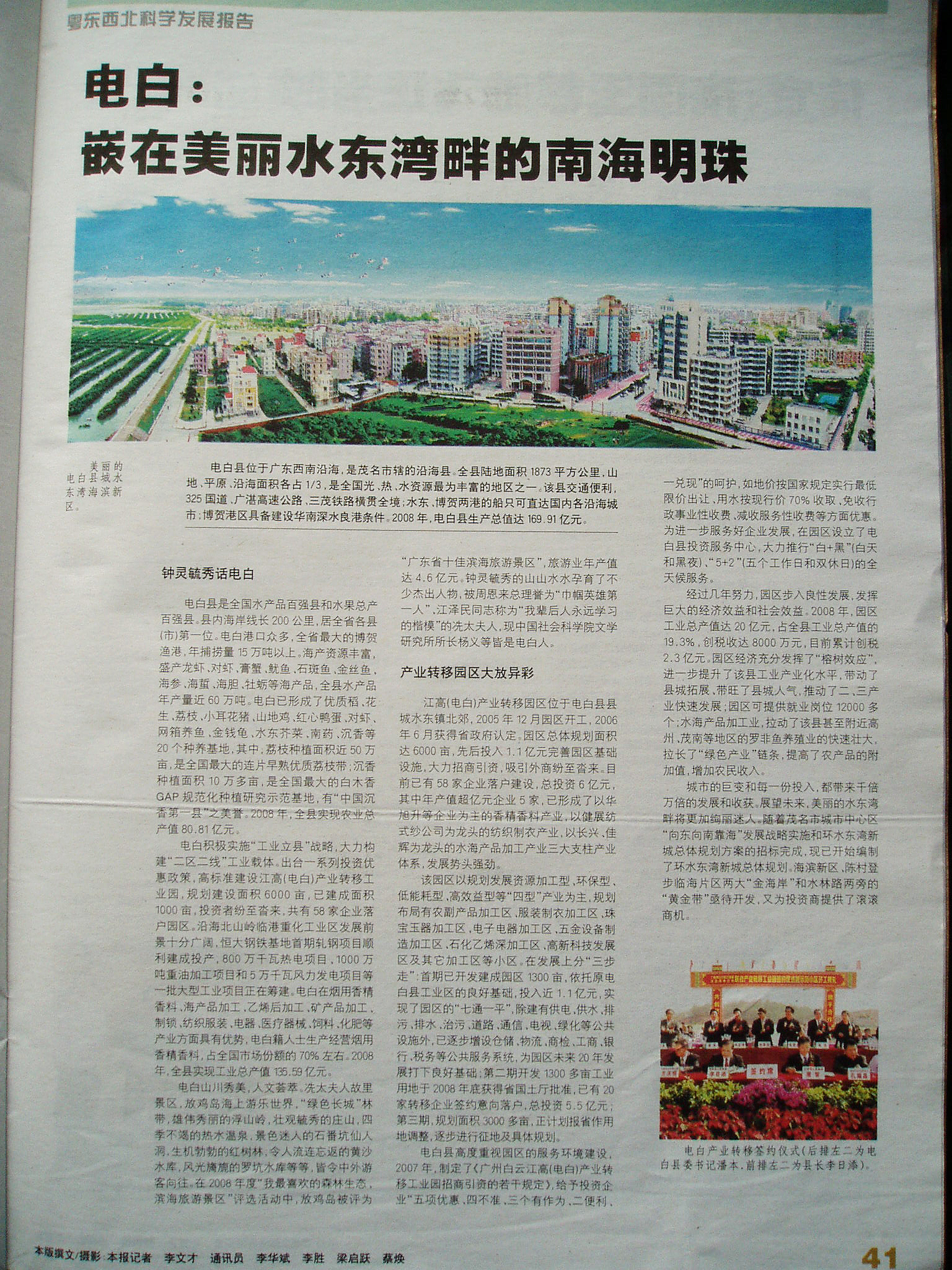 撰稿很缺乏水准,不写好过写,比如放鸡岛被评为广东省十大滨海旅游区,地球人都知道,广东省内只有几个的海滨景区屈指可数,评为十大实在是档次低了。不配放鸡岛水清居世界第二亚洲第一的说法。还有江高转移的政绩已经讲了好几年,老掉牙了,没有亮点。配图PS太假,有一群鸟飞过更假,缺乏实在,搞半天没看清标志物,被忽悠