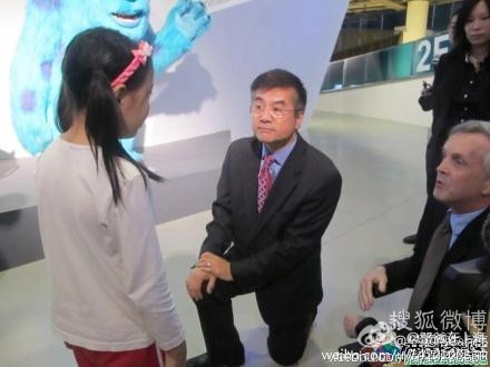 周四晚8点25分,一个三年级小学生,9岁的上海小女孩杨芷湄,网名蟹妹,完成了她参加"鲁迅青少年文学奖"比赛的作文,上传到鲁迅文学网上,题目是《爸爸,请您"跪"下来跟我说话》。文章的主题是批评她的爸爸,从来没有耐心地听她讲过话。列举了其父的种种行为表现。但是她引证了一个心中期望的正面例子,很不得了,乃是当前中国政治环境中最敏感的一个人物,美国大使骆家辉。 骆大使的影响无处不在 去年10月,杨芷湄参加"美国皮克斯动画展",有幸被选中向"全场最大的人物",骆家辉大使提一个问题。小女孩杨芷湄仔细描绘了她提问的经过:"我怯怯地走到他身后,说:'大使先生,你小学时候功课怎么样?'大使惊讶地回过头,用英语说:'为什么问这个问题?'我回答道:"我这次英语考了82分,妈妈骂了我。" 骆大使和翻译单膝"跪"在我面前。我惊呆了。他讲了十几分钟,我被他的动作和周围照相机的闪光吓坏了。我没有记住多少他的话。我的脑海只有他们跪下来的画面。我清晰地看到他关爱的眼神,还有耳边的白头发。 " 杨芷湄和骆大使的照片被登在报纸上,和大使坐经济舱,双肩背一样,引爆了一场舆论争议,攻击者称为"作秀"。有幸小女孩杨芷湄又有机会作出自己的判断:"我爸爸一个美国留学回来的朋友说:美国大人都这样,这是教养。 " 骆大使的行为深深印在这个8岁女孩的心底。今年9岁了,她最大愿望是:"爸爸,你说应该跟我平等对话,为什么不能像骆家辉一样跪下来跟我说话呢?" 这是从小仰视大人的鼻息长大的中国孩子的道德追问。(源自网络)