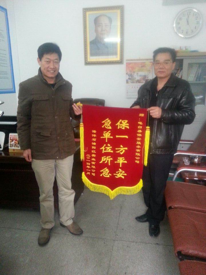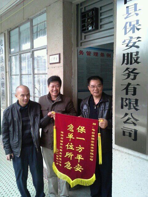 电白县保安服务有限公司于2001年成立以来,公司注重社会效益,一直为各单位提供保安服务,出色完成各项保卫任务,深得服务单位的好评。保安公司派遣四名保安员到海洋石油阳江实业有限公司(林头气库)服务5年,保安员认真履行职责,做好服务区域的防火、防盗、防爆炸、防治安事故等安全防范工作。近日,阳江实业有限公司为感谢保安公司一直提供高质量的服务,特赠送 “保一方平安,急单位所急” 锦旗一面,并向每名保安员送上二千多元的奖励。