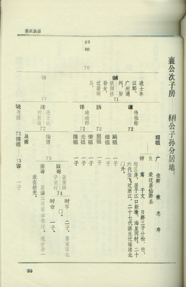 QUOTE(四中乐叔 @ 2007年02月28日 Wednesday, 12:04 AM) 广东省电白县 蔡氏家谱 族谱 蔡族历代祖妣名序列下 始祖秋涧公妣邵氏太恭人生二子 长子度公回莆田 次子竹隐公居P垌(广东省电白县电城镇P垌乡) 祖曾任州太守,福建省兴化府莆田县珠玑巷人。离任归里路过P垌时,见此地风土人情甚佳,举家自宋末帝m(约公元一二七八年)时,由原籍迁居P垌,即电城东十里之P垌乡,并带祖父济阳公塑像,将之供祀于村边新建济阳公祠,今境主庙前戏台后,而起旧址也,俗称“妆春宫”以后代虔诚之心,后代子孙繁衍,人口增多便成为蔡屋村。清道光年间,秋涧子孙定阴历元月十五日为济阳公祭祀日,每隔一年元月十四、十五、十六日为“年例期”,搭演戏,举行“妆春”扮演话剧等民间活动,俗称扮“佛地”以表鞭鞑,迎接福祥。 来时带有压船石版一块、石臼一只,现有存在。石版在庙前、石臼在山觅太夫人庙边。回想自宋至今数百年之久,传有卅余代,其后裔之盛,族旺之隆,冠于全邑,非祖德之远庇,安能若是乎,天之功报厚德者,理有或爽哉。 祖享寿七十九岁,于元十八年二月十七忌日。 妣享寿七十二岁,于元十二年三月十六忌日。 大宗祠建P垌内村屯,坐西向东。入伙对联:长发其祥,暖(?)得我所。大宗祠门联:济阳欣庆,f垌分基。蔡族济阳郡。 祖妣合葬白花岭大垌村后坐甲向寅。 二世祖竹隐公妣吴氏太孺人生四子。 长子荣贵公迁林头(电白县林头乡)为始祖,次子居P垌,三子道公迁迁潮州,四子度公回莆田 边地头 [snapback]1684989[/snapback]