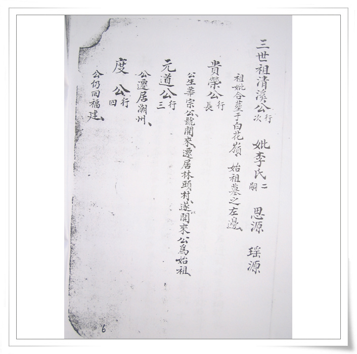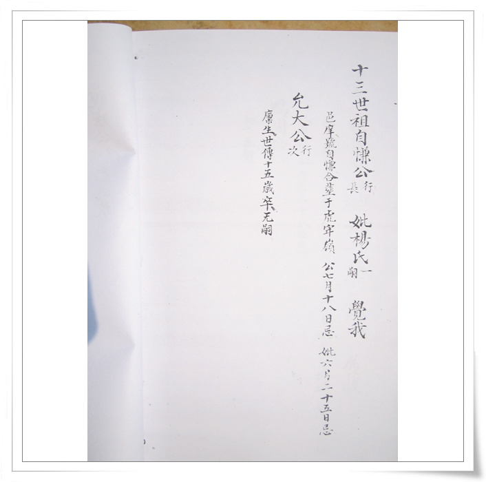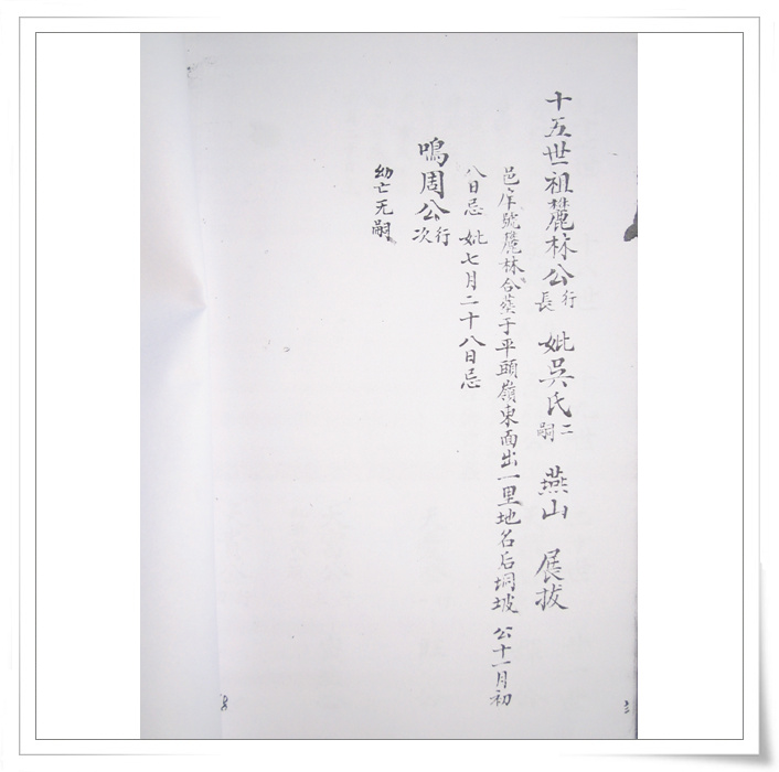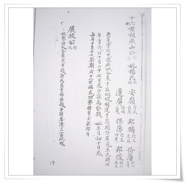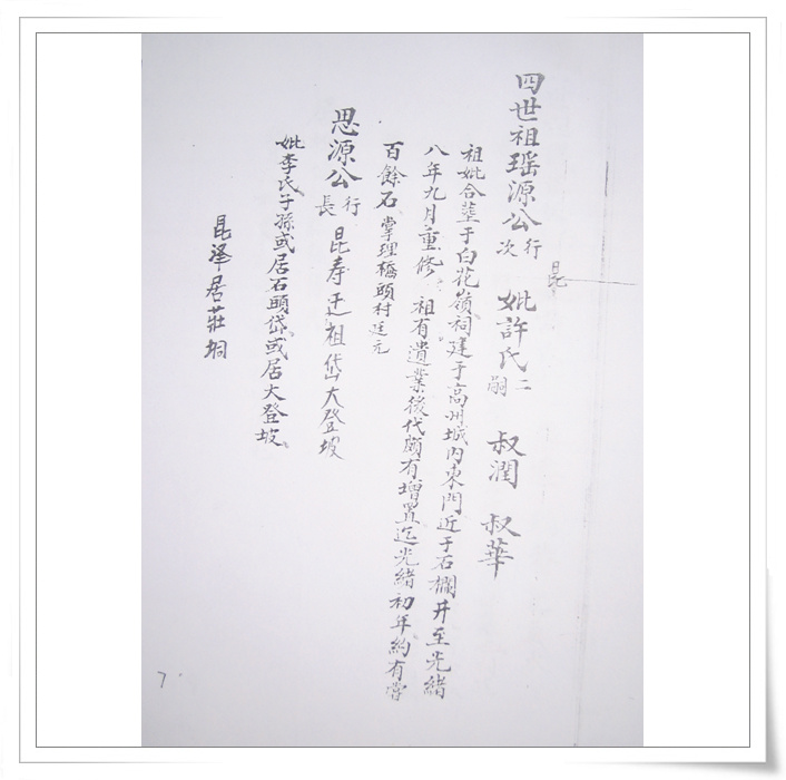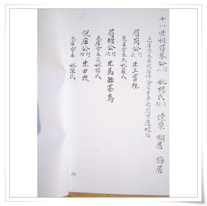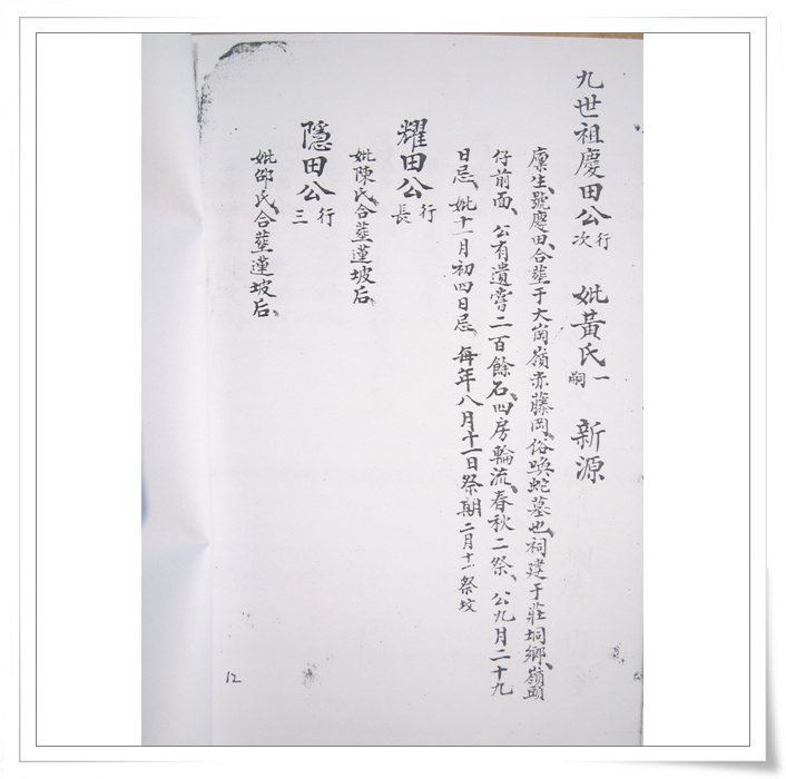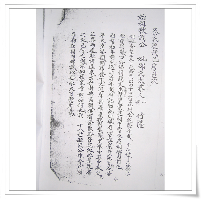 四中乐叔 版主 版主 注册 2006-05-06 消息 6,725 反馈评分 3 点数 61 2007-04-15 #74 QUOTE(四中乐叔 @ 2007年02月28日 Wednesday, 12:04 AM) 广东省电白县 蔡氏家谱 族谱 蔡族历代祖妣名序列下 始祖秋涧公妣邵氏太恭人生二子 长子度公回莆田 次子竹隐公居P垌(广东省电白县电城镇P垌乡) 祖曾任州太守,福建省兴化府莆田县珠玑巷人。离任归里路过P垌时,见此地风土人情甚佳,举家自宋末帝m(约公元一二七八年)时,由原籍迁居P垌,即电城东十里之P垌乡,并带祖父济阳公塑像,将之供祀于村边新建济阳公祠,今境主庙前戏台后,而起旧址也,俗称“妆春宫”以后代虔诚之心,后代子孙繁衍,人口增多便成为蔡屋村。清道光年间,秋涧子孙定阴历元月十五日为济阳公祭祀日,每隔一年元月十四、十五、十六日为“年例期”,搭演戏,举行“妆春”扮演话剧等民间活动,俗称扮“佛地”以表鞭鞑,迎接福祥。 来时带有压船石版一块、石臼一只,现有存在。石版在庙前、石臼在山觅太夫人庙边。回想自宋至今数百年之久,传有卅余代,其后裔之盛,族旺之隆,冠于全邑,非祖德之远庇,安能若是乎,天之功报厚德者,理有或爽哉。 祖享寿七十九岁,于元十八年二月十七忌日。 妣享寿七十二岁,于元十二年三月十六忌日。 大宗祠建P垌内村屯,坐西向东。入伙对联:长发其祥,暖(?)得我所。大宗祠门联:济阳欣庆,f垌分基。蔡族济阳郡。 祖妣合葬白花岭大垌村后坐甲向寅。 二世祖竹隐公妣吴氏太孺人生四子。 长子荣贵公迁林头(电白县林头乡)为始祖,次子居P垌,三子道公迁迁潮州,四子度公回莆田 边地头 [snapback]1684989[/snapback] 附件 IMG_0078.jpg 105.3 KB · 查看: 814 IMG_0079.jpg 159.7 KB · 查看: 817 IMG_0080.jpg 123.1 KB · 查看: 860 IMG_0081.jpg 160.4 KB · 查看: 905 IMG_0082.jpg 116.6 KB · 查看: 892 IMG_0083.jpg 121.2 KB · 查看: 904 IMG_0084.jpg 108.9 KB · 查看: 796 IMG_0085.jpg 125.8 KB · 查看: 853 IMG_0086.jpg 118.2 KB · 查看: 829 IMG_0087.jpg 121.4 KB · 查看: 818 IMG_0088.jpg 108.4 KB · 查看: 809 IMG_0089.jpg 118.7 KB · 查看: 854 IMG_0090.jpg 121 KB · 查看: 924 IMG_0091.jpg 109.2 KB · 查看: 828 IMG_0092.jpg 103.6 KB · 查看: 833 IMG_0093.jpg 93.8 KB · 查看: 815 IMG_0094.jpg 88.6 KB · 查看: 793 IMG_0095.jpg 94 KB · 查看: 717 IMG_0096.jpg 124.4 KB · 查看: 813 IMG_0097.jpg 110 KB · 查看: 756