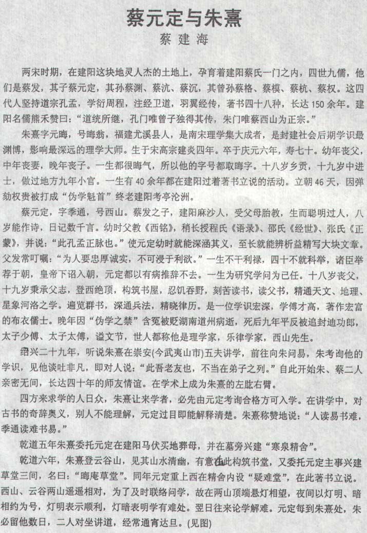 宋高宗绍兴五年乙卯(1135) 十一月十一日辰时,生于建宁府建阳县麻沙镇(今福建省建阳市麻沙镇)蔡氏书宦世家。 先祖蔡炉(856~950),字延器,弋阳郡光州固始县人,唐僖宗乾符五年戊戌(877)中进士,任德州知州,迁东昌刺史。唐昭宗乾宁二年乙卯(895),以守郡功加封凤翔节度使,便宜行事。乾宁四年丁巳(897)为避中原战乱,率部五十三姓入闽,为建阳县长官。“观县治之西七十里名曰永忠之麻沙,钟光岳之英、孕山水之秀,(唐)天复二年壬戌(902)正月初十日择镇北而居之,以为子孙长久之计焉。”(《庐o蔡氏族谱》卷一,丙辰民国五年刊,第1页) 祖父蔡谅(1069~1130),字守信,号首阳居士。姿貌魁秀,气宇闳远,自为书生时,持身甚严。宋绍圣四年丁丑(1097),由乡贡入太学,时宰蔡京以宗姓故,力荐之,擢太学录。“崇宁间,劝徽宗以刚仁勤俭治国,勉蔡京以清慎正直事君,及不当以司马光、吕公著等为奸邪,刻石恐彰君相之过。京大怒,将加遣谪,即弃官归隐”。(《庐o蔡氏族谱》卷一,第20页) 父蔡发(1089~1152),字神与,号牧堂,著名理学家、天文学家和地理学家,著《地理全书》、《河洛图象》、《发微论》等书行于世。提出“地动”学说(即地球围绕太阳旋转),早于西方哥白尼400年。自蔡发开始,子元定及元定三子渊、沆、沉和四孙格、模、杭、权,四世九儒,集注经书,羽翼朱熹,继承孔孟正脉,发孔孟之未发,成为中国学术思想史上的千古佳话。 是年,岳飞率部击退金军,高宗还临安,命张浚为宰相,岳飞进剿杨么起义军,理学家杨时(1053~1135)死。 ☆[明]赵文书《建阳县志书序》:“予建阳处八闽之上游,为一郡之首邑。九o山色高耸云中,两坊书籍通行天下,乃文公讲道之乡,非他邑所可及也。”(《嘉靖建阳县志》卷首,1962年4月上海古籍书店据宁波天一阁藏明代嘉靖刻本重印) ☆明《嘉靖建阳县志》卷三:“麻沙八景――岱山夕照,烟村春雨,云岩山色,祗园溪声,松岗夜涛,莲湖晚风,武陵桥月,象岩晴雪。”(《嘉靖建阳县志》卷三,第十四页) ☆明《嘉靖建阳县志》卷三:“书籍出麻沙、崇化两坊,昔号图书之府。麻沙书坊……偕刘蔡二氏新刻书版浸盛,与崇化并传于世,均足以嘉惠四方云。”(《嘉靖建阳县志》卷三,第三十三页) ☆[宋]翁易《蔡氏诸儒行实》:“先生在娠,神与君设古今圣贤像俾詹氏日夕观之,以慕太任胎教。故先生生而颖悟,异于常儿,八岁能作诗文,十岁日记数千言。稍长,群居中若老成人,即教使读西铭,临终又以孔孟正脉属之。深涵其义,辨析益精,登西山绝顶忍饥啖荠以读书。”(建阳市蔡氏九儒学术研究会编《潭阳蔡氏九儒书》首卷,2000年11月印制,第10页)” ☆朱熹:《跋蔡神与绝笔》云:“自幼警悟,七岁即能为诗。既长,博学强记,高简廓落,不能与世俗相俯仰,因去游四方,闻见益广。遂于易象天文地理三式之说,无所不通,而皆能订其得失……蔡公平生所以教其子者,不干利禄,而开之以圣贤之学,则其志识之高远,故已非世人所及矣。”(《朱子全书》第二十四册,上海古籍出版社、安徽教育出版社2002年12月第1版,第3908~3909页) ☆蔡发《天文星象总论》云:“天至大而无所不包,其形如弹丸,朝夕运转。中有南北两端,后高前下,乃枢纽不动之处。其运转者亦无形质,但如疾风之旋。”(《潭阳蔡氏九儒书》,第15页) 绍兴十二年壬戌(1142),8岁 生而颖悟,异于常儿,八岁能诗文,十岁日记数千言。 是年,宋进表于金,称臣割地,高宗封秦桧为太师、魏国公。 ☆[宋]刘~《西山先生蔡公墓志铭》云:“父发,博览群书,号牧堂老人。妣詹氏。先生在妊,牧堂以圣贤遗像设别室,使詹氏日夕观仰焉。先生生而颖悟,异于常儿,八岁能诗文,十岁日记数千言。”(《潭阳蔡氏九儒书》卷二,第65页)” 绍兴十四年甲子(1144),10岁 父发教读《西铭》,每天能记数千字;又教以《程氏语录》、邵雍《经世》、张载《正蒙》等书,系统接受儒家正统教育。 是年,江浙、福建大水,建州水入城,深数丈,死数千人。 ☆[宋]刘~《西山先生蔡公墓志铭》云:“牧堂先生以《西铭》等书,又以程子《语录》、张子《正蒙》、邵氏《经世》,且语之曰:‘此孔孟正脉也’。先生幼而沉涵其议,长而辨析益精。”(《潭阳蔡氏九儒书》卷二,第65页)” 绍兴二十二年壬申(1152),18岁 父发病逝,葬父于崇安县上箬之源。父亲对元定影响深远,导读读圣贤之书,传授天文、地理和象数易学,并诫以忠诚厚实、不求仕途、不干利禄,勉招杀身之祸。元定对父亲感情深厚,庐墓守孝三年,并谨记父训,终生不仕。 是年,宋虔州兵变,旋败。时主将常役使兵士以谋私。去年,抗战名将韩世忠(1089~1151)、女词人李清照(1084~1151)死。 ☆朱熹《跋蔡神与绝笔》云:“友生蔡君季通一日奉书一卷以示熹而泣拜,且言曰:‘此先人绝笔之书也。先人自幼警悟,七岁即能为诗。既长,博学强记,高简廓落,不能与世俗相俯仰,因去游四方,闻见益广。遂于易象天文地理三式之说,无所不通,而皆能订其得失。中年乃归,买田筑室于武夷之阳。其间屡遭盗贼水火之变,而浩然不以屑意,杜门扫轨,专以读书教子为事。元定生十岁,即教使读西铭。稍长,则有示以程氏语录、邵氏经世、张氏正蒙等书,而语之曰:此孔孟之正脉也,而其勉旃。晚岁属疾,手书此纸,以付元定。其他叮咛之语,亦无不出于忠厚诚实,而尤以没溺于利欲为杀身之戒。元定涕泣拜受,于今四十年,既不能拳拳服膺,以无失坠,而又不能有以表著而
