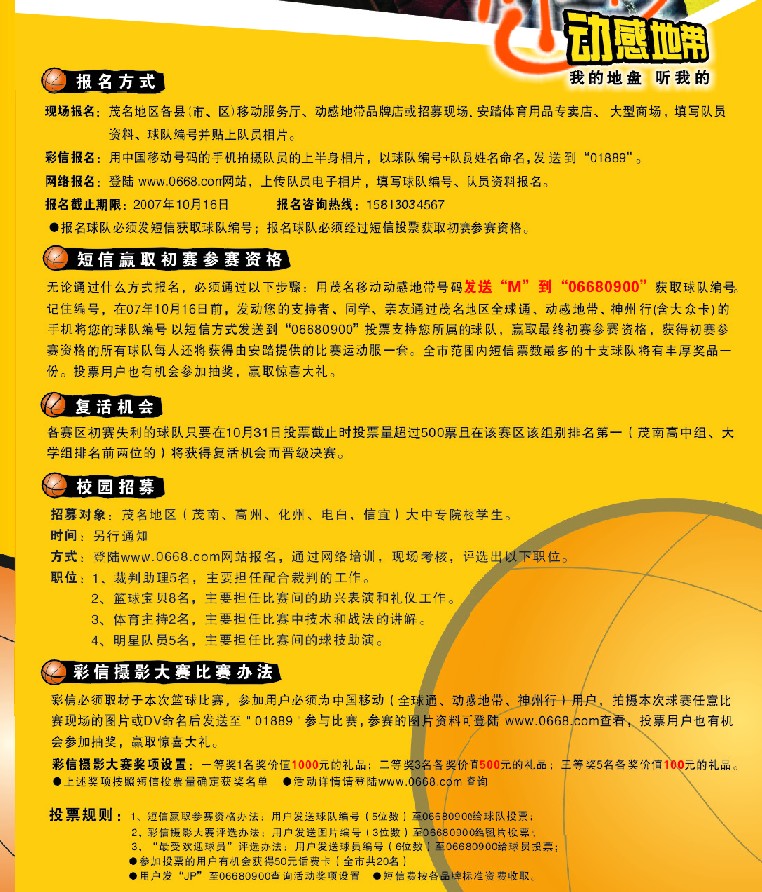 1、这个比赛移动公司并不是为了赚钱!完整地举行一个比赛,至少要10多万,大家想想 100支队 每支发100条短信,按0.1元计算,也不过1000元,移动公司有必要赚这个钱吗? 2、举行一个比赛,也只是想给篮球爱好者提供一个竞技的平台,严格来说,这仅仅是一个品牌营销,就是为了让更多的人认识动感地带! 3、参加比赛并不一定要得到最终的第一,但是参加比赛最少可以提高自己,可以认识自己。