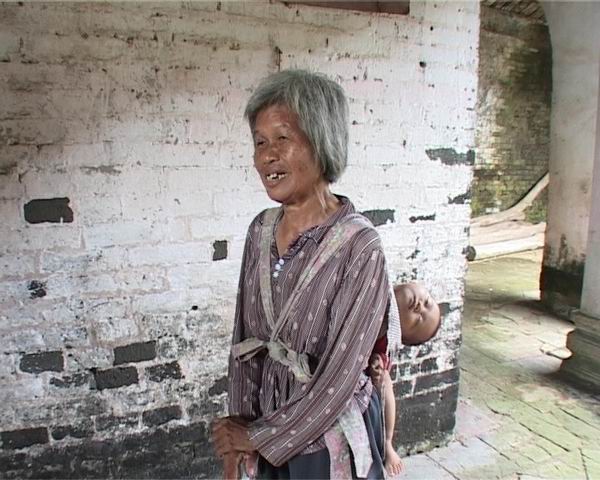 村民唱起古老的客家农事歌谣《点兵歌》。她背着的这个小孩在吴氏家族的排辈为十八世。