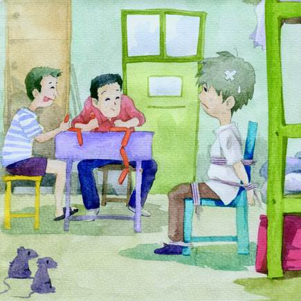 能三个人一起参与的游戏是打牌。山贼在走廊里大喊一声:打牌啦!于是就会由很多人过来,挑最早过来的人,用暴力轰走吃来的人,就可以开始了