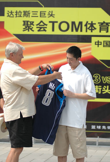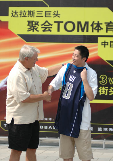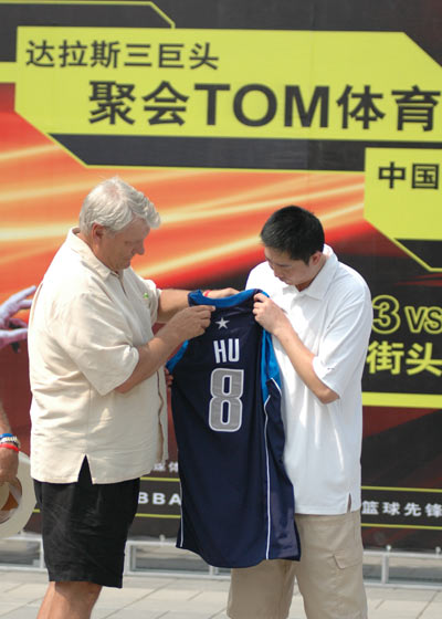 这次老尼尔森和哈里斯来到北京,主要就是为了完成这个未了的心愿。他们将借TOM网站举办三对三篮球赛的机会,给胡卫东送上迟到的一件小牛队球衣。