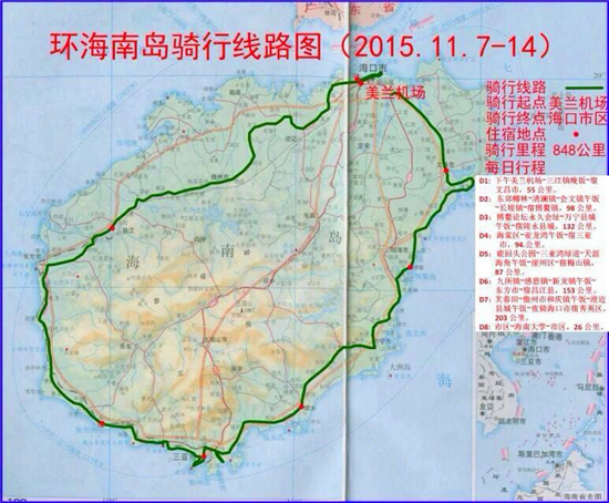 一个新骑友,热爱骑行,没有骑长途的经验,却是来一次说走就走的长途,实在让人感到意外,也让人佩服。从水东一直到海南来回,全程差不多1000公里,在路途中认识了一大群五湖四海的车友,一路互助,共勉,平平安安的骑完全程,令他兴奋不已。 ---可惜图片不多。 [attachmentid=346001] 上面的图片是引自和他半路偶遇一起骑车车友的路线图。 [attachmentid=346002]