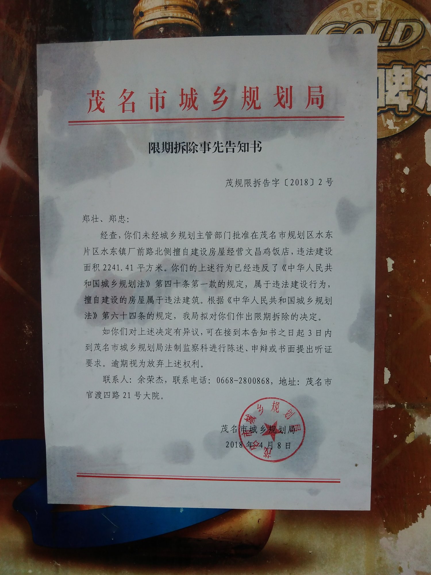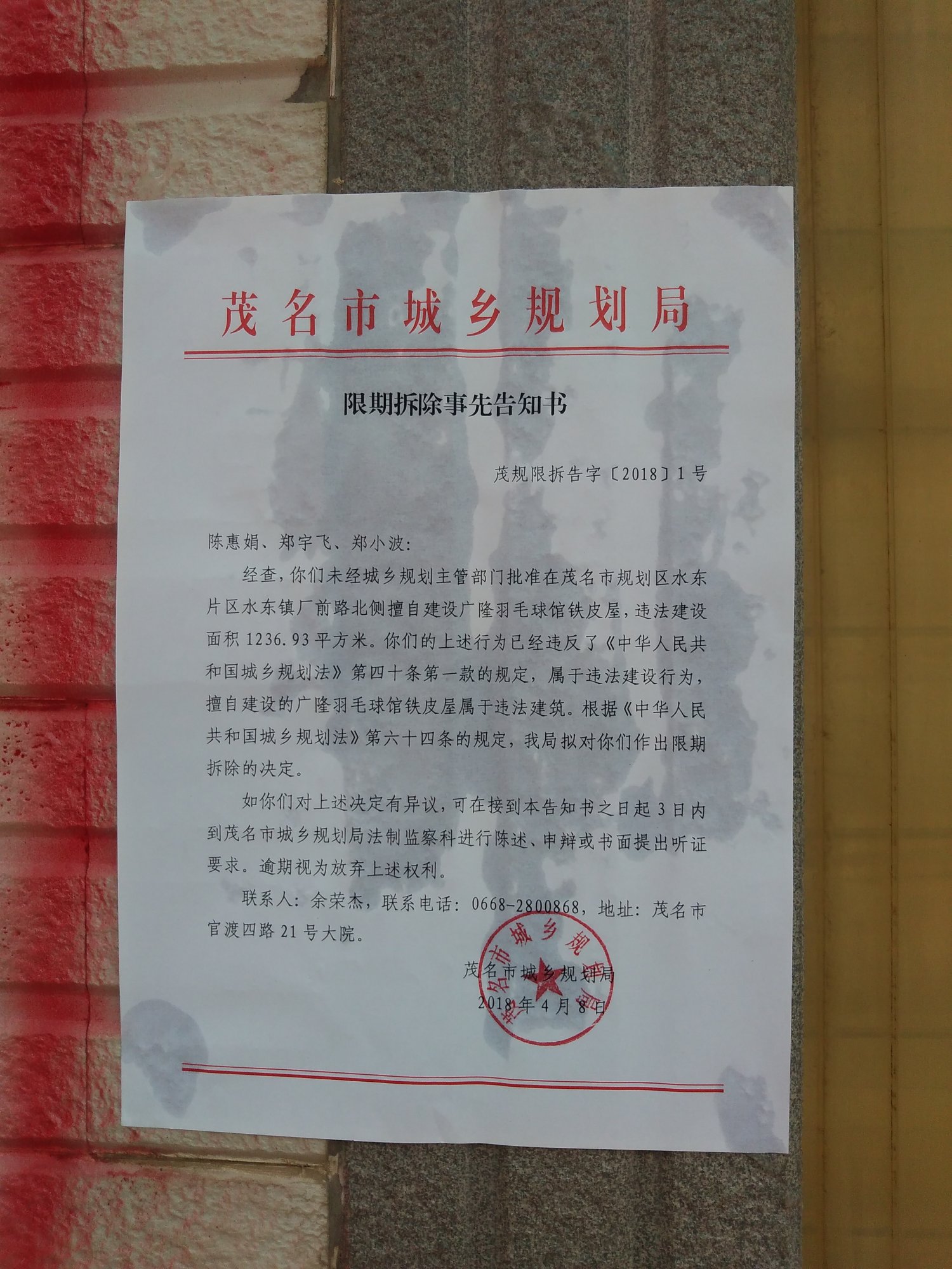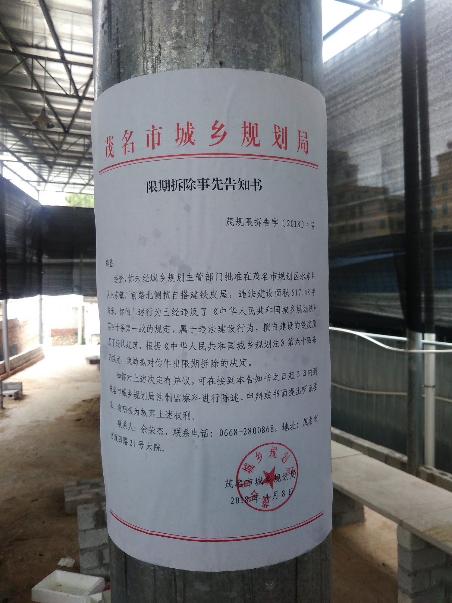 茂名市城乡规划局下达限期拆除通知的红头文件,之前村民第二次到区政府静坐抗议时,村委代表们当天也去了茂名市信访局。至于这些部门怎么协调工作无人知晓,推来推去不知道哪里能话事。后来听村民说茂名市领导指责电白区城建部门胡搞瞎搞,事情源于2008年村民去北京上访,后拦截回来作出的协议不符规章。说来也是觉得有点奇葩,区里已经定性非法违建还要搞到市局再来定性一次,这次由茂名市城乡规划局领导亲自下来到厂前路违建现场走一趟,一起陪同他们去粘贴公告,到底是谁在幕后左右阻碍政府拆违工作,搞的停滞不前个个怕事?
