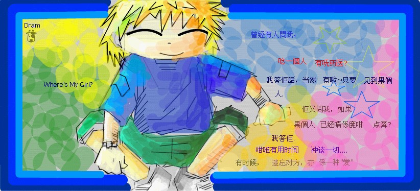 小曼蛙 ☜εїз...Leah's Dreams...εїз☞ 荣誉会员 注册 2004-12-05 消息 11,317 反馈评分 0 点数 61 年龄 40 2005-04-24 #3 这个算不算呀。 在SIm涂鸦留言板画的。 附件 tu.jpg 15.4 KB · 查看: 363