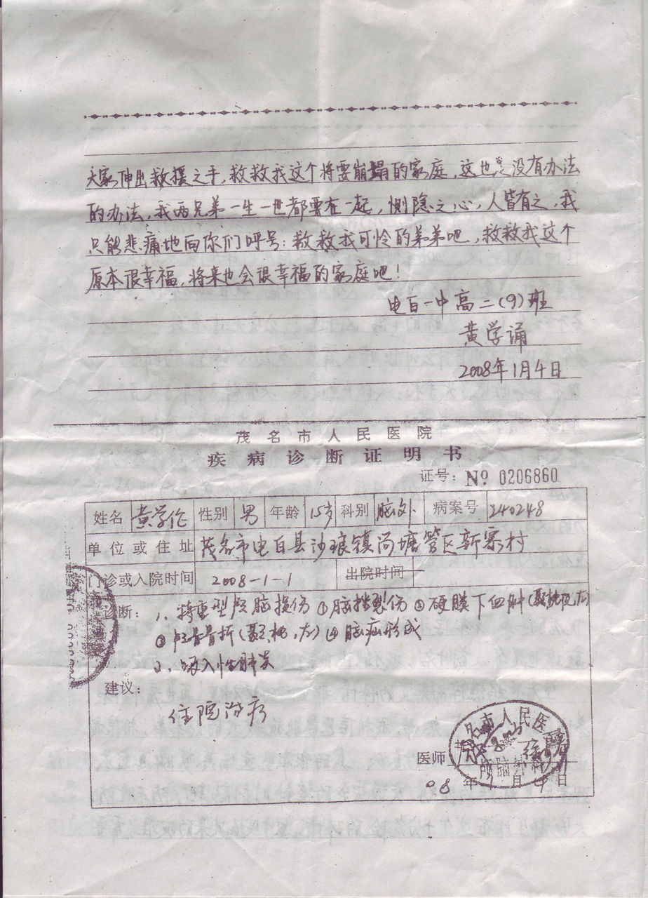 可是,一场残酷的车祸把电白中学初三(7)班的黄学伦同学带到了死亡的边缘,肇事者早已逃之夭夭。现在茂名市人民医院治疗。