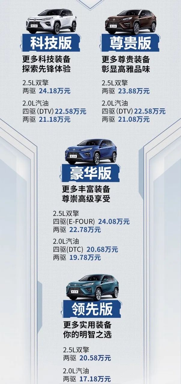 和一汽丰田RAV4相比,威兰达最低配的定价更低,但同时配置也更斋,并不是走量车型,更多是宣传噱头。两者的走量车型在价格和配置上都相差不大,各位大可以“以貌取人”。