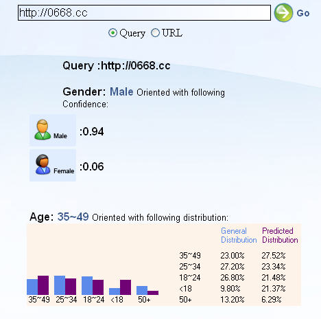 虽然我们不能确切了解这个这个新工具的原理,但是它确实能够给URL链接一个以百分比表示的“性别取向”以及年龄分布。