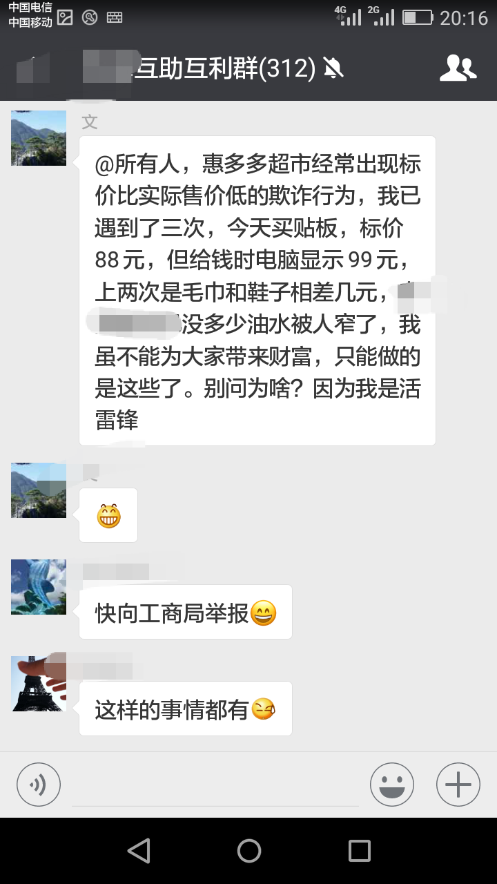 D dbxqj 初中二年级 注册 2012-09-19 消息 450 反馈评分 19 点数 1 2018-05-07 #5 昨天我买了一条红萝卜和青瓜,说是特价九毛九一斤,买的菜较多也不看标签,跑回家一看标签特价了还是安原价计算的。我以为是算标签的阿姨疏忽大意,且就几毛块钱事情也不跑回去理论了。没想到还有这么多事情!难道是管理不严吗?明明特价,算价时按原价算?还有至多问题,惠多多是否要反思?失信的事少做的好吧?失民心者失天下呀!