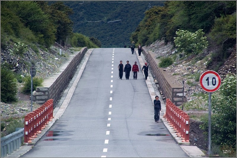 通麦天险和排龙天险是连在一起的,长约十多公里,路很窄,泥土路,地质结构松散,很滑,一面是悬崖,一面是深谷,很多地方不能会车,只能单车通过。很难想像这就是川藏路唯一的通道,那些大车是怎么过的。好在我们的车小,又有四驱,问题不大,另外有了前几天险路的经历,也没觉得这个地方比想像中更险。只是达咏开的很快,让人有一些担心。