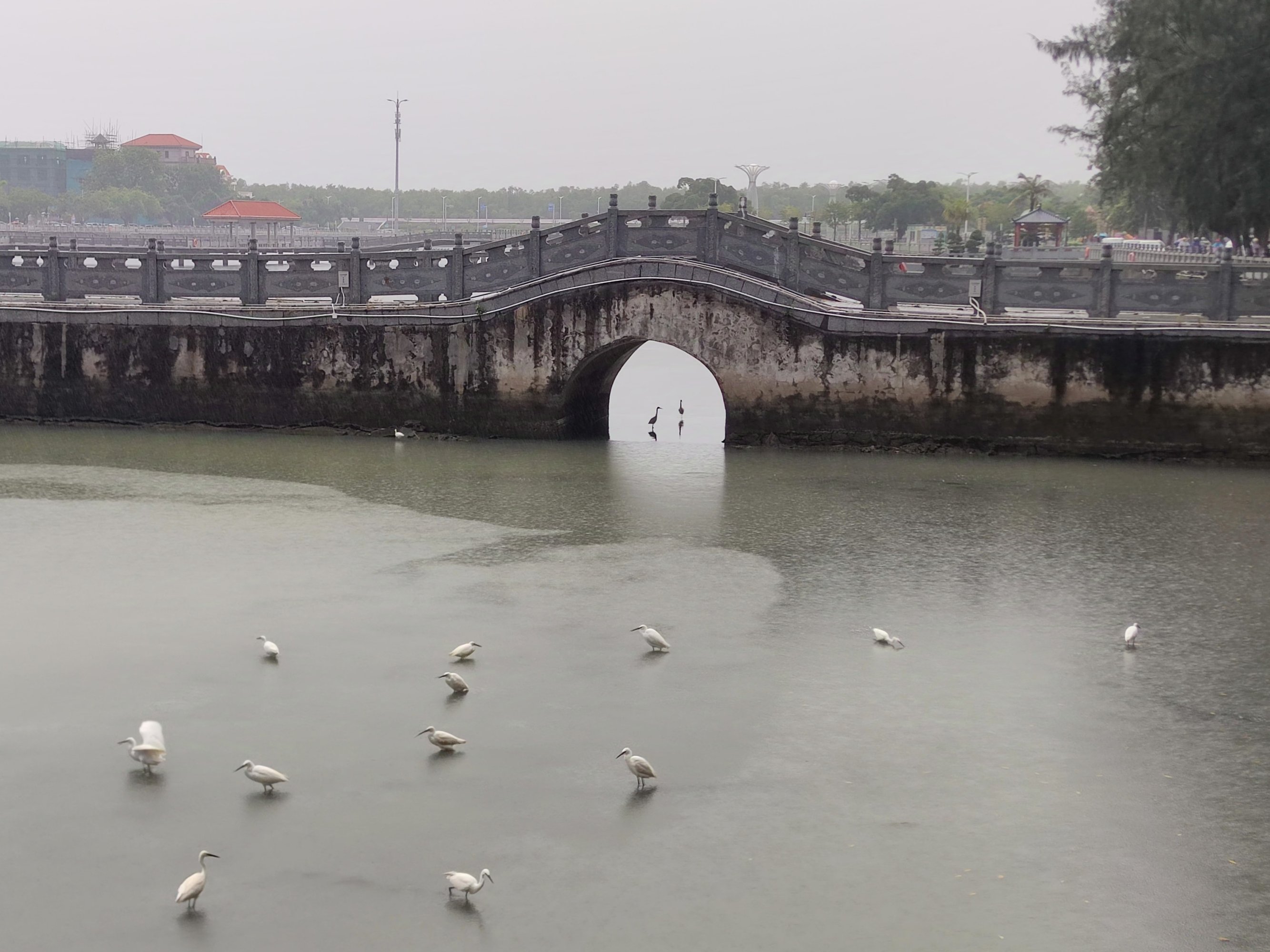 雨,担着雨具途经东湖,见到湖面有白鹭等鸟儿在湖面觅食戏闹等~