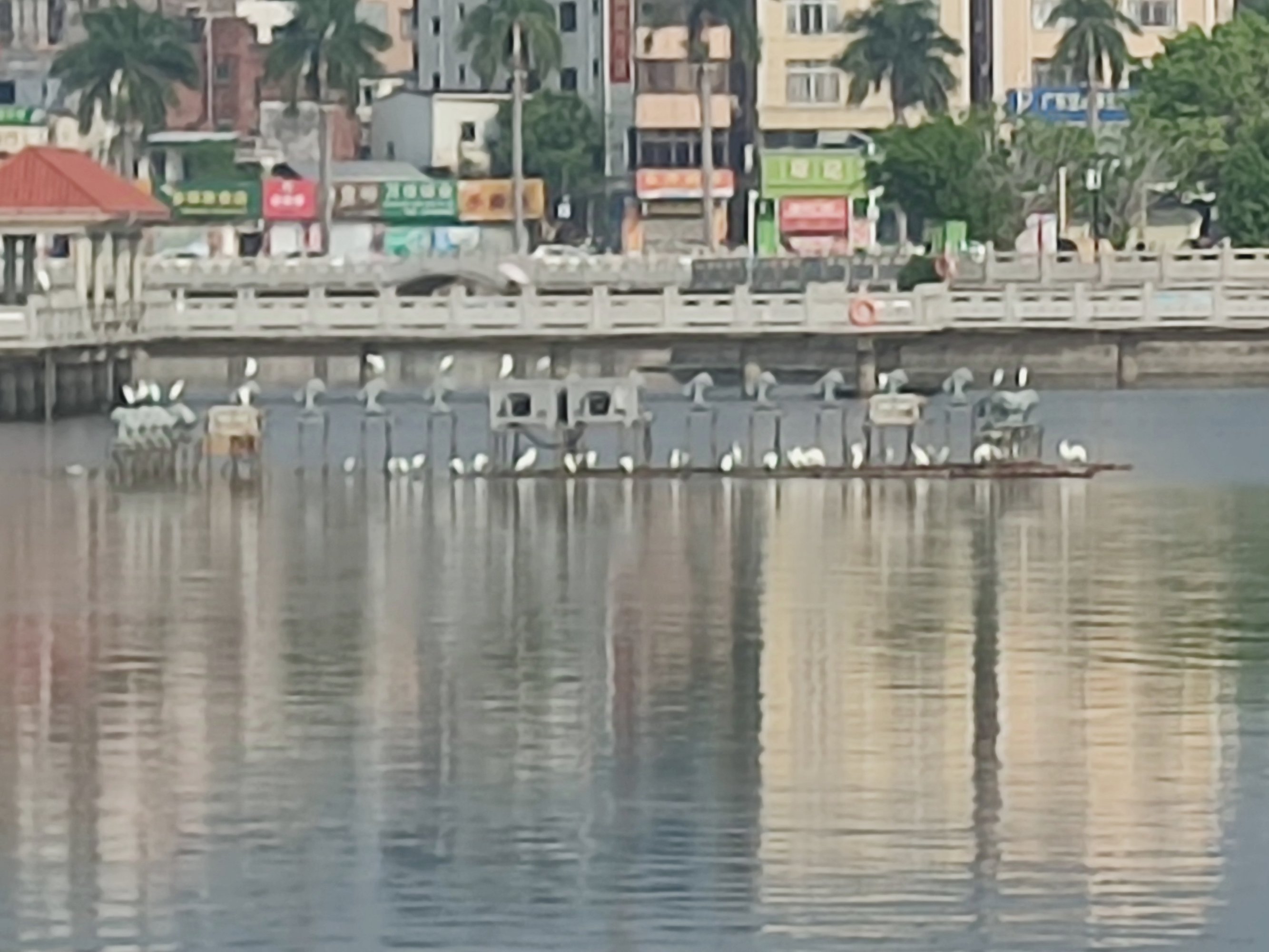 湖的另一端,有好多鹭鹭等鸟儿,在堤围边~