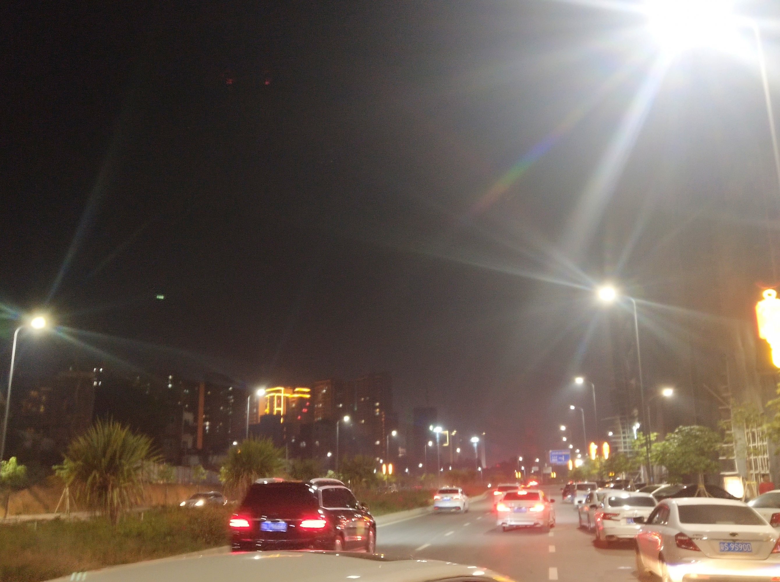 像灯柱上的喜庆灯也亮起来,10点几了还车来车往、、