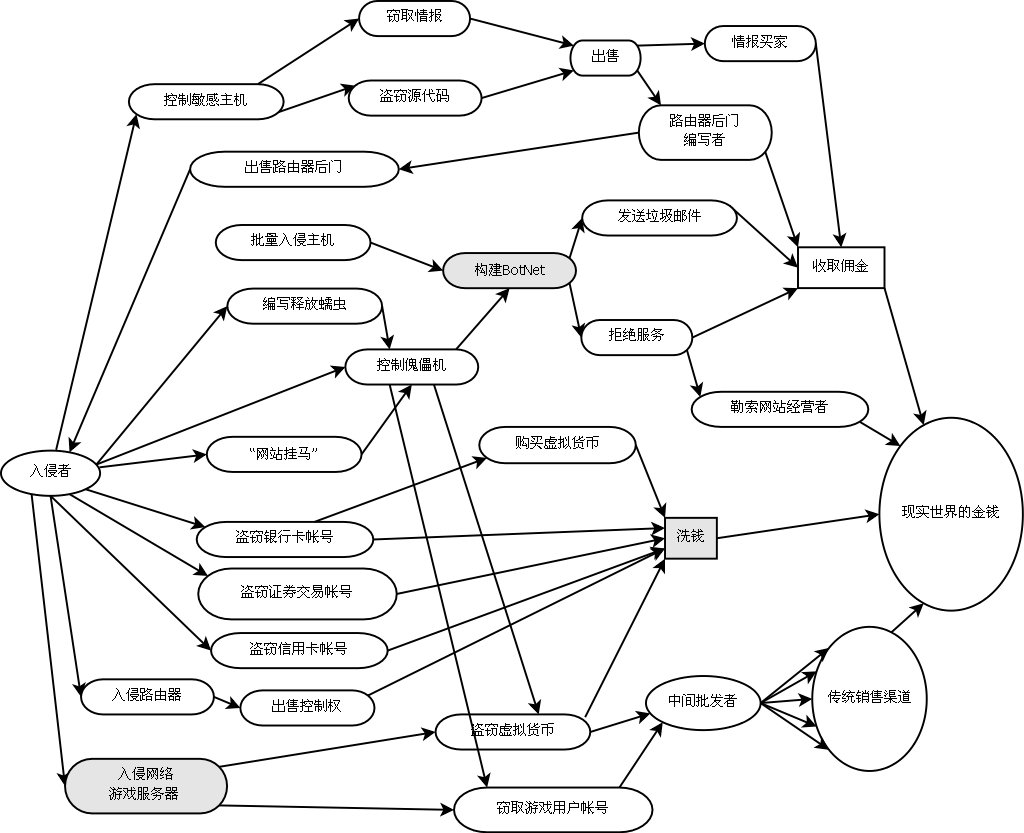 2005年底,绿盟科技的研究人员于?在为公安部信息安全通报中心进行培训时,曾经画了一幅中国的网络犯罪产业链,从这幅图中我们可以看到,入侵者获取金 钱的方式,已经从窃取情报、源代码到盗窃银行卡帐号、证券交易帐号、盗窃虚拟货币、盗窃QQ及游戏帐号、用拒绝服务攻击进行勒索、发送垃圾邮件等……