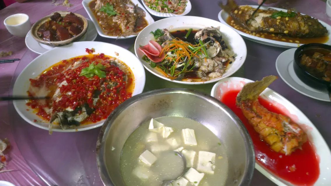 湖口县城双钟镇品尝全鱼宴。鄱阳湖的淡水鱼品种多多,做法也多多,丰盛咧!